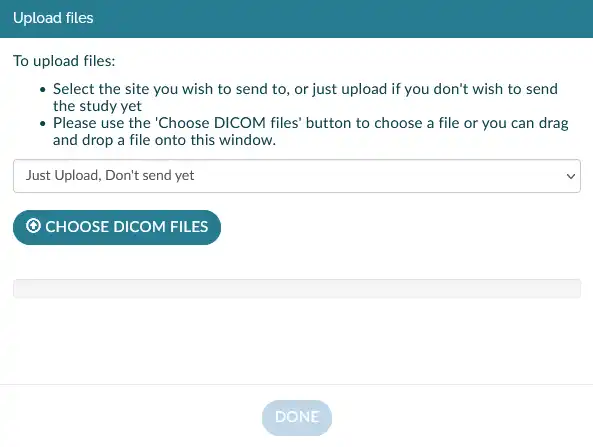 • The dialog will allow you to upload files either by drag and dropping files onto the window or using the Choose DICOM Files button